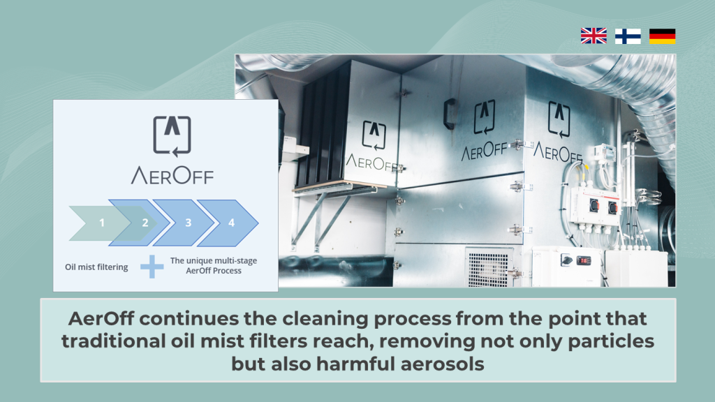 AerOff-ratkaisu metallintyöstöön jatkaa siitä, mihin perinteiset öljysumusuodattimet pystyvät ja poistaa hiukkasten lisäksi myös terveydelle haitalliset aerosolit.