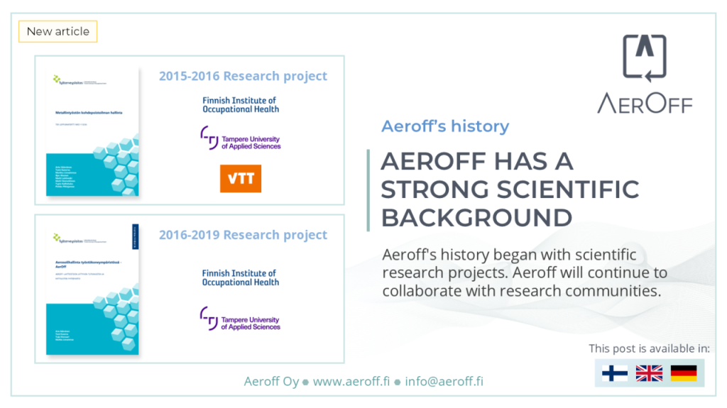 Aeroff hat einen starken wissenschaftlichen Hintergrund. Die Geschichte begann 2015 mit einem Projekt, an dem die Hochschule Tampere, das Technologieforschungszentrum VTT und das Finnische Institut für Arbeitsmedizin beteiligt waren. Das Projekt wurde auf Anregung führender Unternehmen der finnischen Metallindustrie gestartet. Ziel war es, eine Lösung zum Entfernen schädlicher Kühlschmierstoff-Aerosole aus der Luft zu entwickeln. Auf dem Markt gab es zwar Filter, die Partikel aus dem Ölnebel entfernen konnten, nicht aber schädliche gasförmige Verbindungen. Die erste Idee für die AerOff-Lösung für die Metallbearbeitung entstand während dieses Projekts.