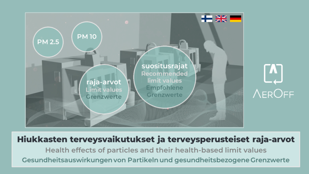 Für PM 2,5 und PM 10 liegen mehrere empfohlene Grenzwerte vor. Die Weltgesundheitsorganisation WHO empfiehlt 24-Stunden-Grenzwerte für PM 2,5 und PM 10 von 15 µg/m³ bzw. 45 µg/m³. In Finnland liegen die 24-Stunden-Grenzwerte gemäß STM 545/2015 bei 25 µg/m³ (PM 2,5) und 50 µg/m³ (PM 10). Die 24-Stunden-Grenzwerte sind nicht vollständig vergleichbar mit der Exposition an einem 8-Stunden-Arbeitstag. Dennoch geben sie einen Hinweis auf sichere Werte.