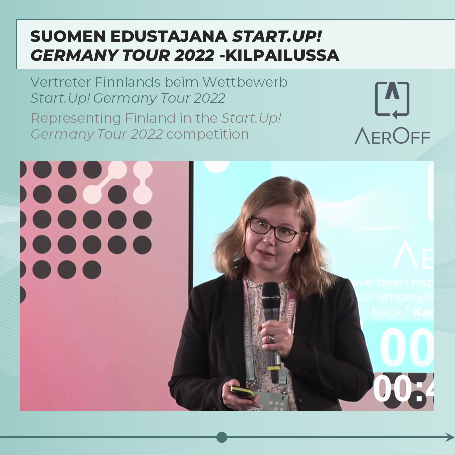 ? In 2022, Aeroff represented Finland in the international competition Start.Up! Germany Tour and was a finalist itself. Aeroff’s CEO Hanna Pihlajarinne remembers: “Pitching on stage in front of a large audience, warmed by the bright spotlight, was a unique experience!”