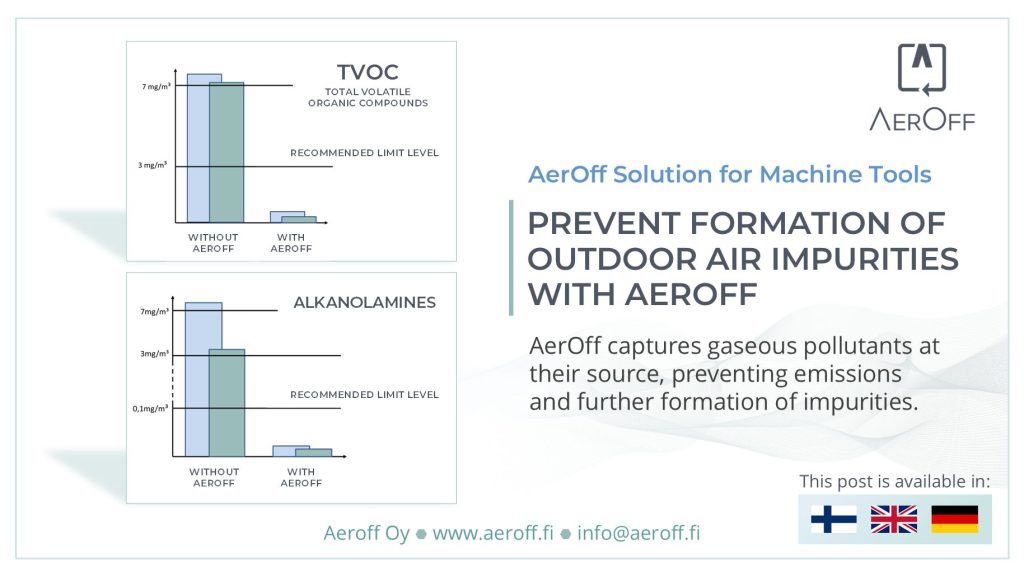 Effective and environmentally friendly industry emission control requires reducing gaseous compounds as well. The AerOff Solution for Machine Tools effectively removes pollutants at their source and prevents their release into the environment. Accredited measurements by the Finnish Institute of Occupational Health have proven the effectiveness of our solution in removing VOCs and alkanolamines.