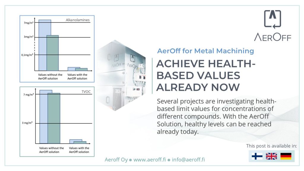Eri maissa sekä lisäksi EU-tasolla suoritetaan erilaisia terveysperusteisiin raja-arvoihin liittyviä hankkeita. Monivaiheisen AerOff-ratkaisun avulla saavutetaan jo nyt terveellisiä haihtuvien orgaanisten yhdisteiden (VOC) ja alkanoliamiinien tasoja, kuten Työterveyslaitoksen tekemät akkreditoidut mittaukset todistivat.